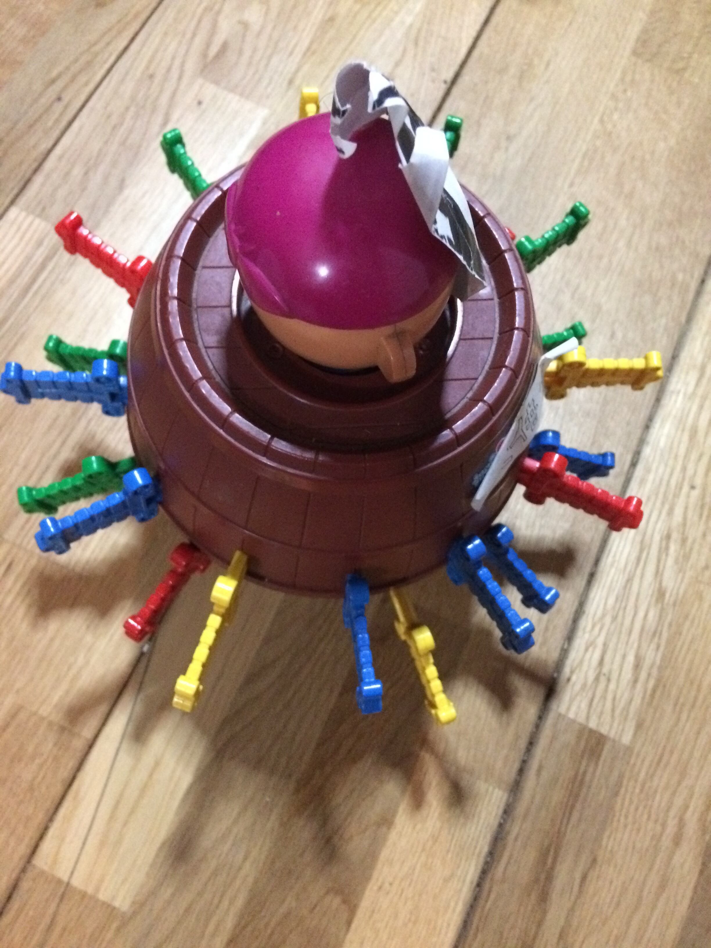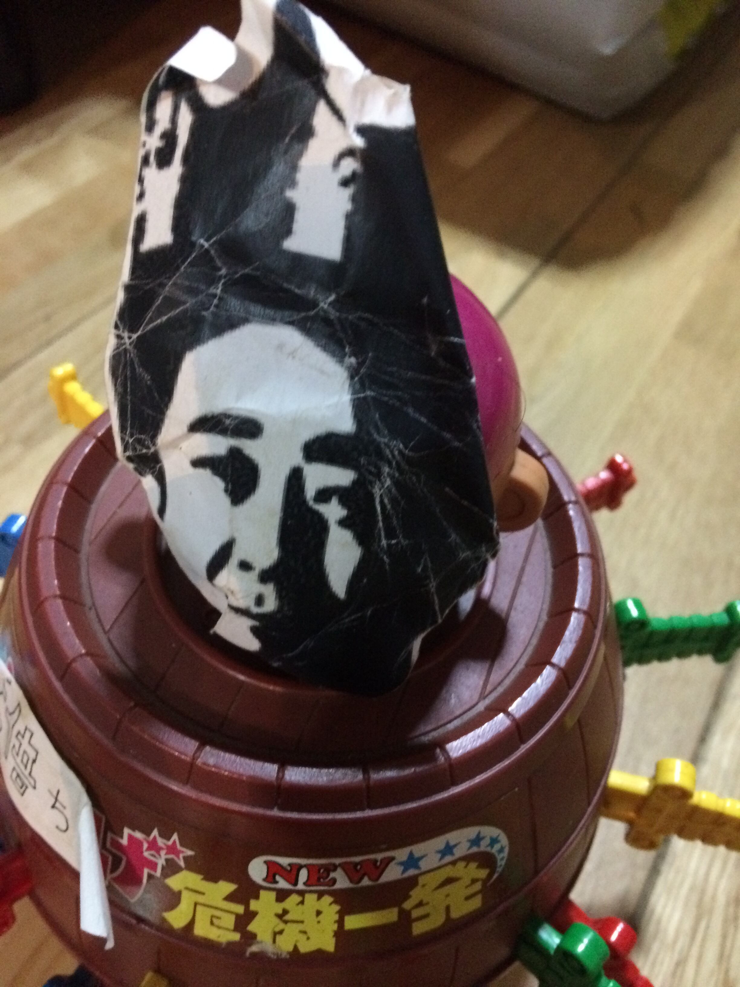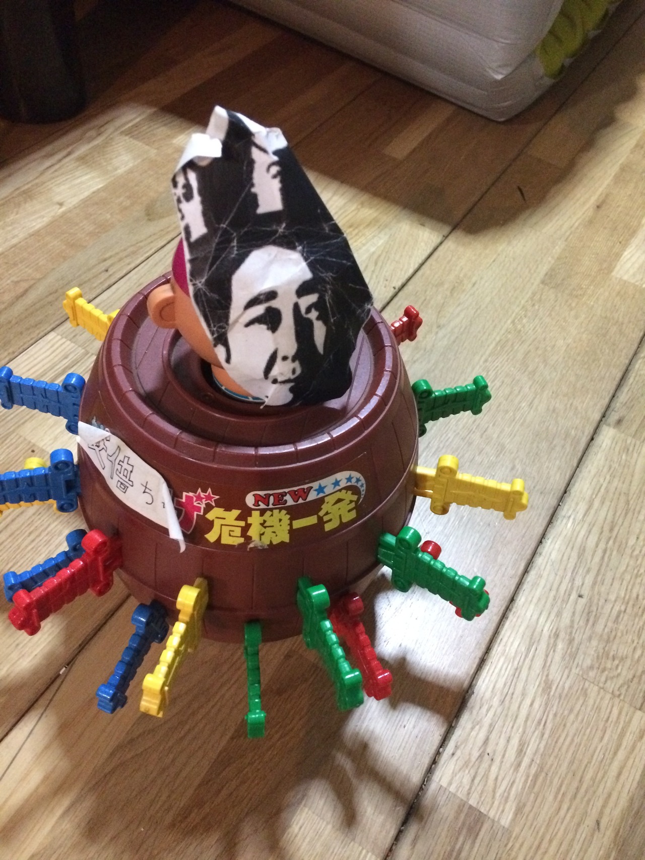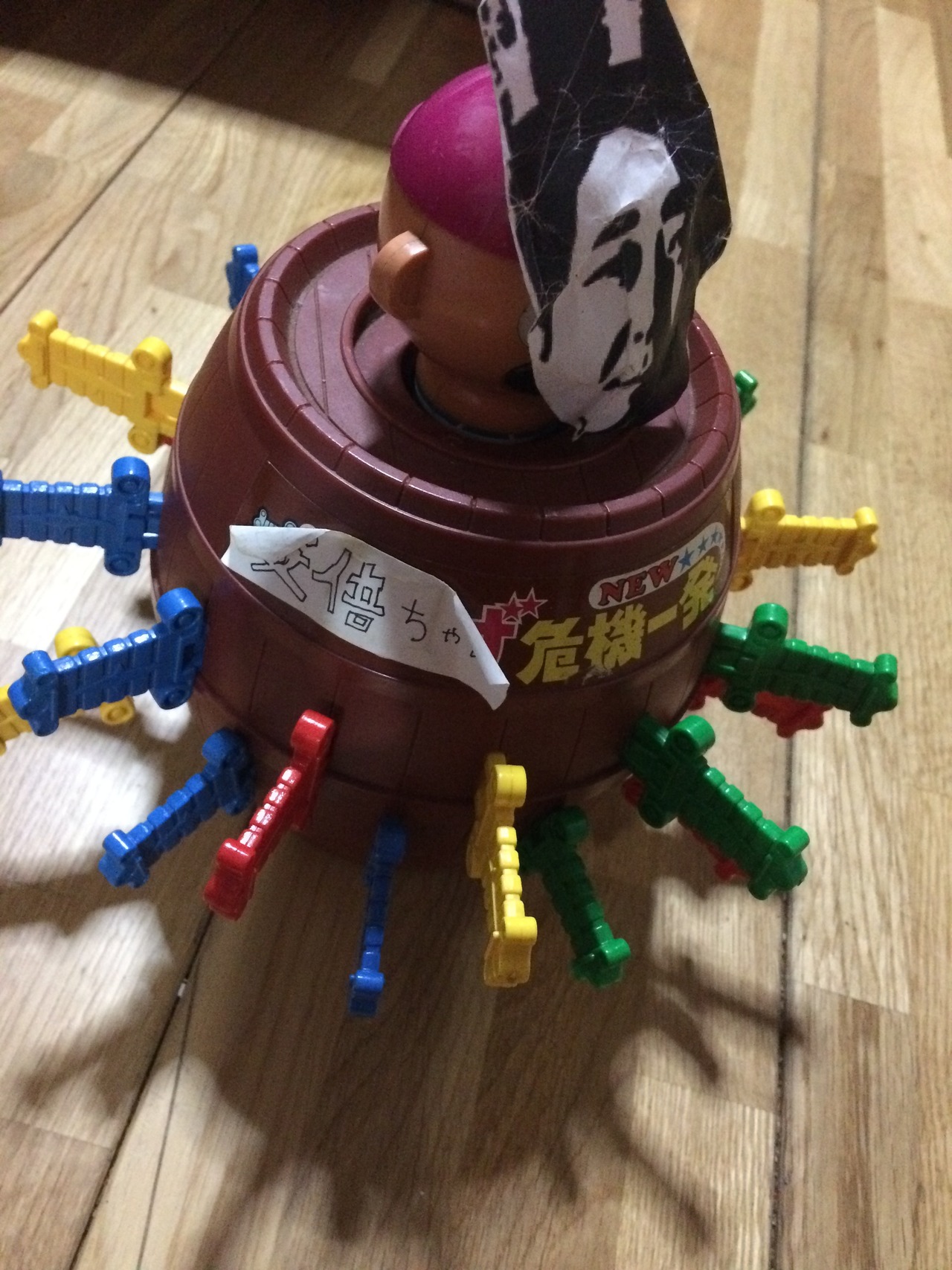 お店のようなものでよく使用されていた「安倍ちゃん危機一発」です。近所の小学生が一指し20円で遊んでいました(当たるとお菓子がもらえる)。剣が一本足りません。